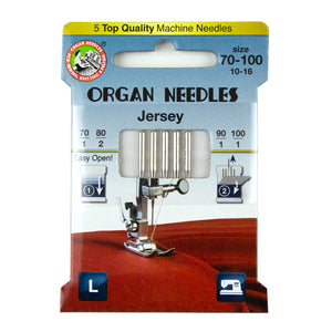 This Organ Jersey Needles Assortment contains one 70/10 size needle, one 90/14 size needle, one 100/16 size needle, and two 80 size needles. These medium ballpoint needles are suitable for sewing with woven and knitted fabrics such as: jersey, fleece, and stretchy rayon. Good for use with threads from 60 wt. (light) to 12 wt. (heavy).